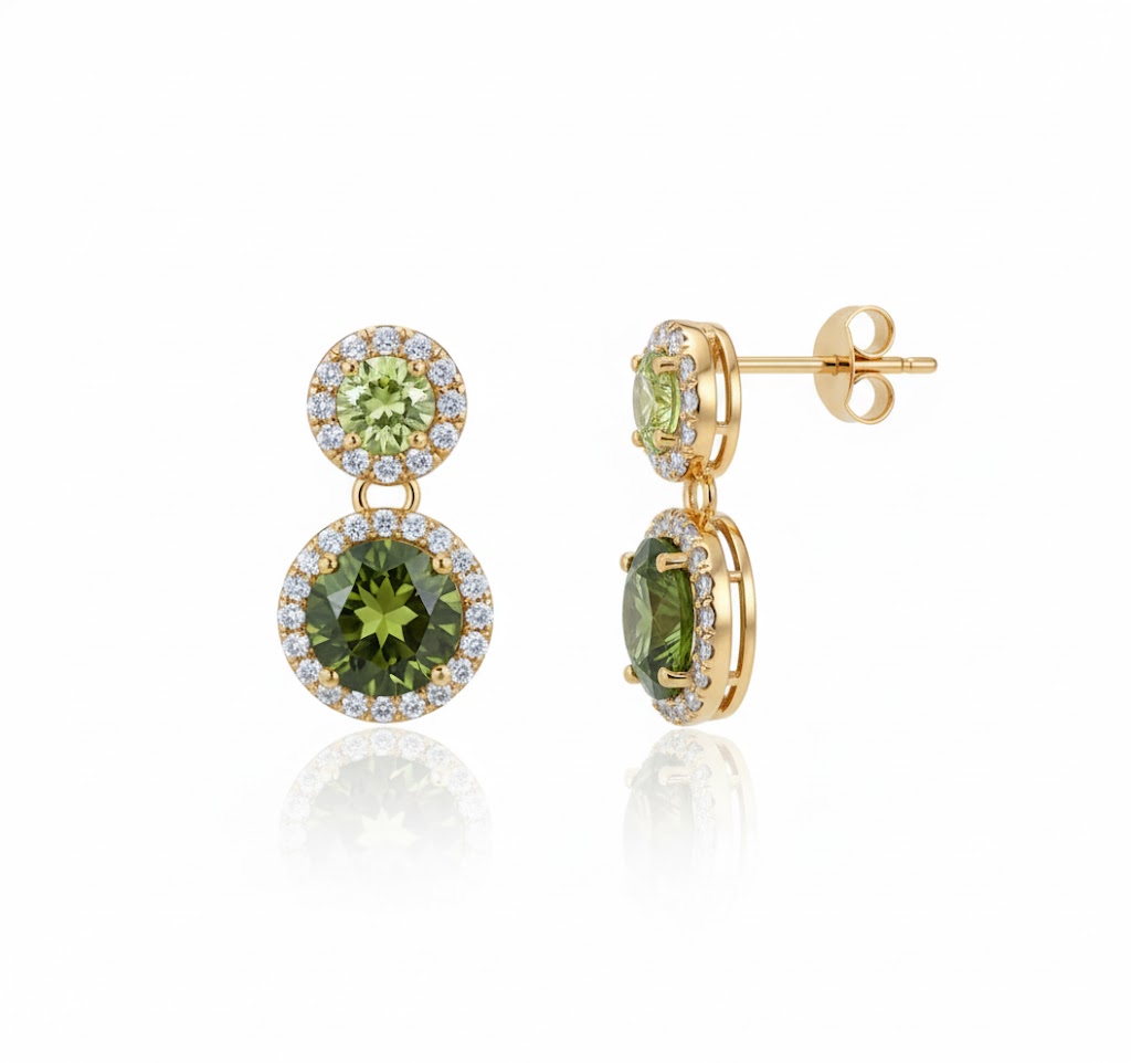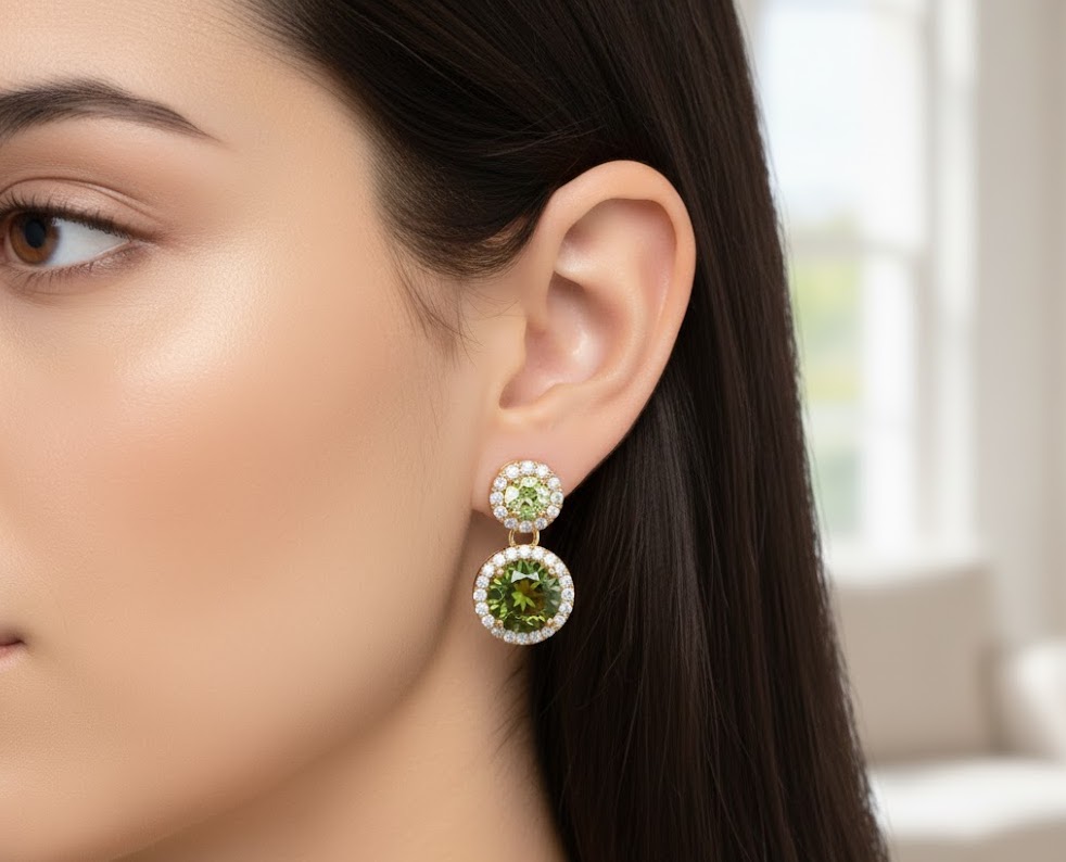 大小2つのグリーンストーンを連ねた、ラグジュアリーなダブルサークルピアス。煌めくホワイトストーンで囲まれたデザインが耳元に華やかさをプラスし、動きに合わせて上品に揺れます。深みのあるグリーンが大人の魅力を引き立て、フォーマルにもパーティーにも最適。