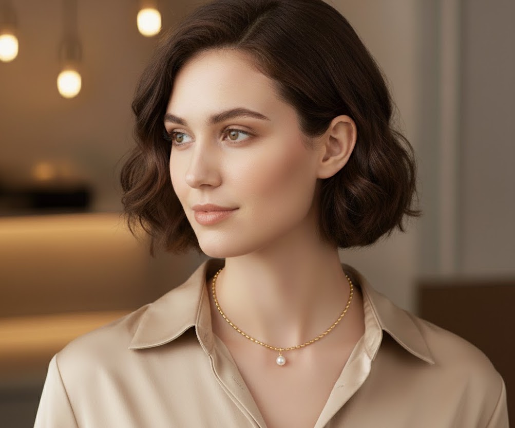 一粒パールが上品に揺れる、ゴールドネックレス。