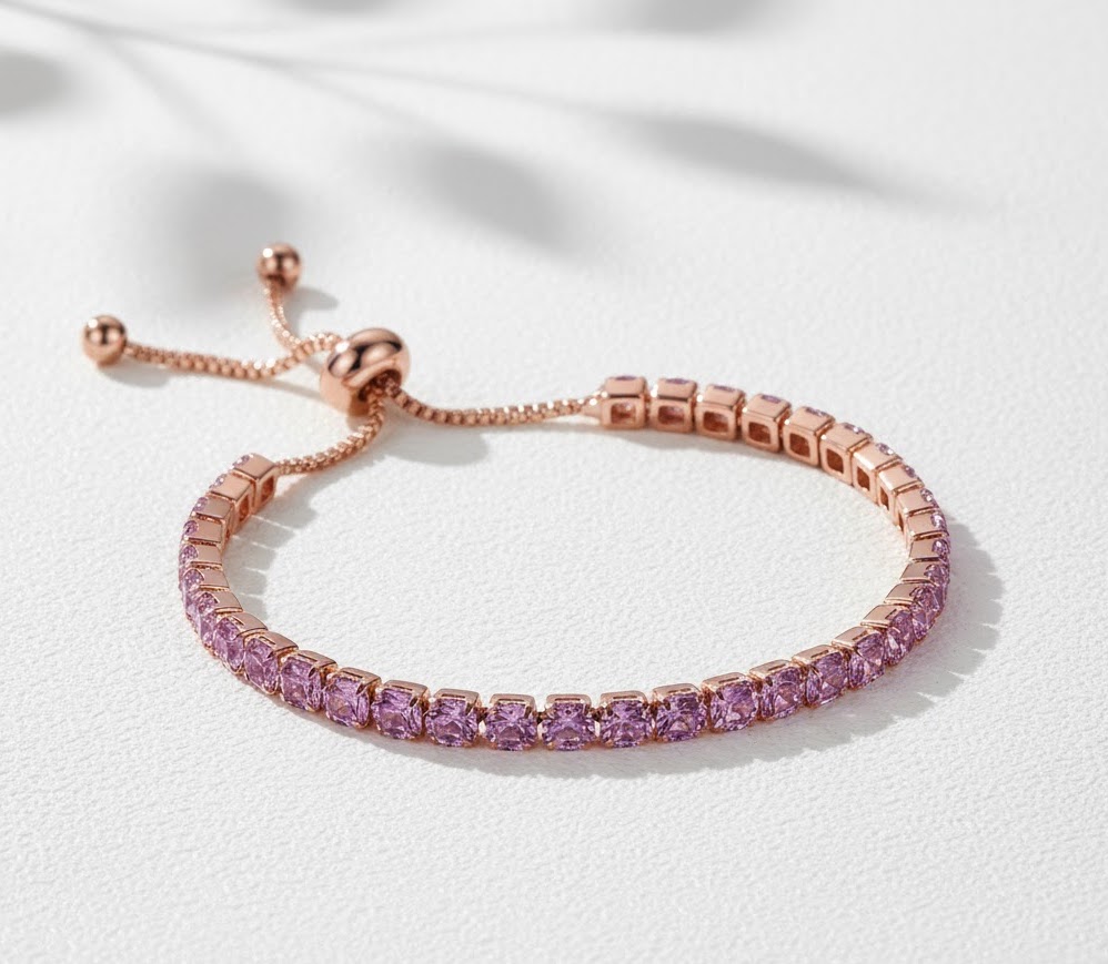 スライド式アジャスターによりフィット感を細かく調整でき、日常からフォーマルまで快適に着用可能。華奢でありながら高級感が際立つ、永く愛用できる上質なジュエリーブレスレットです。