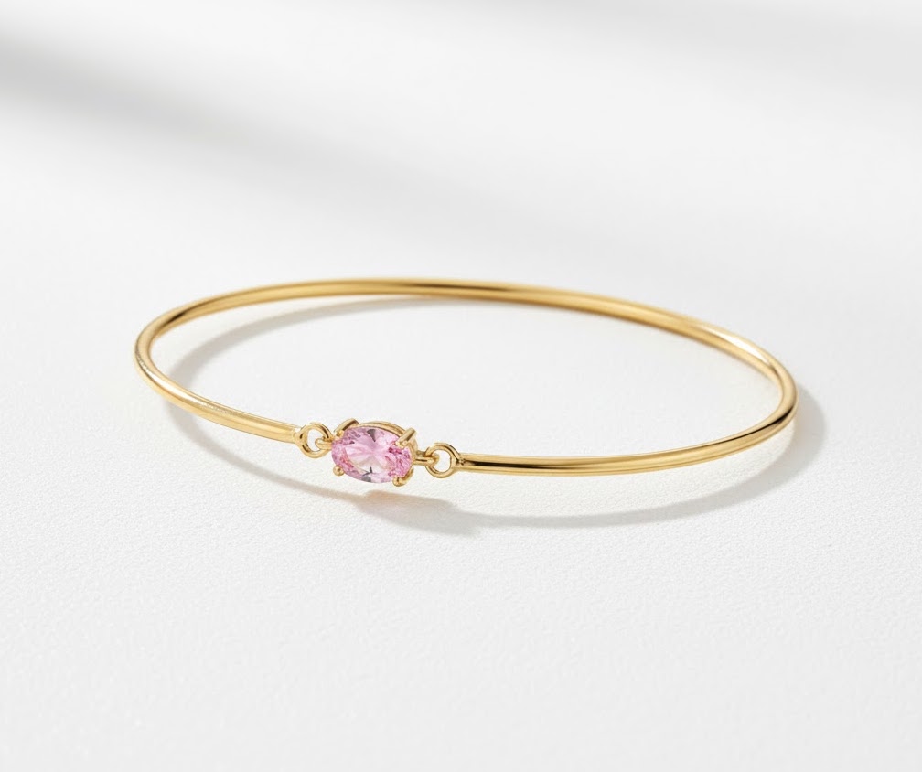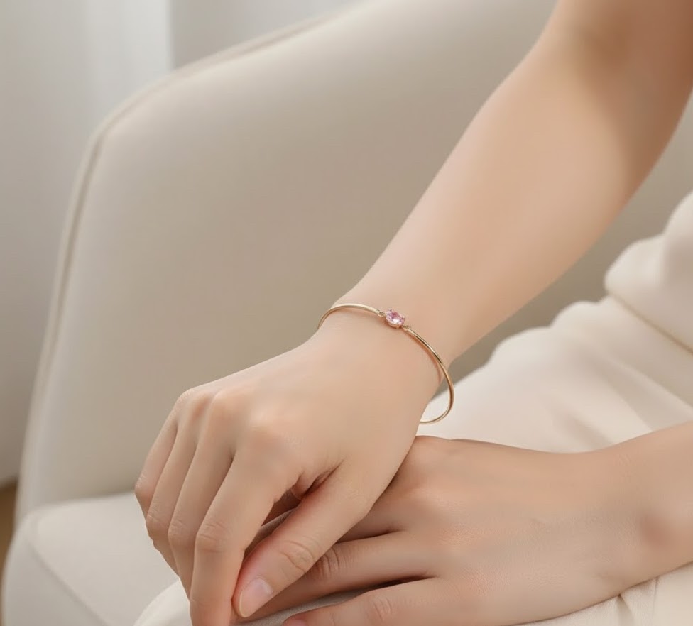 繊細なゴールドのラインに、淡く輝くピンクストーンを中央に一粒あしらったバングル。